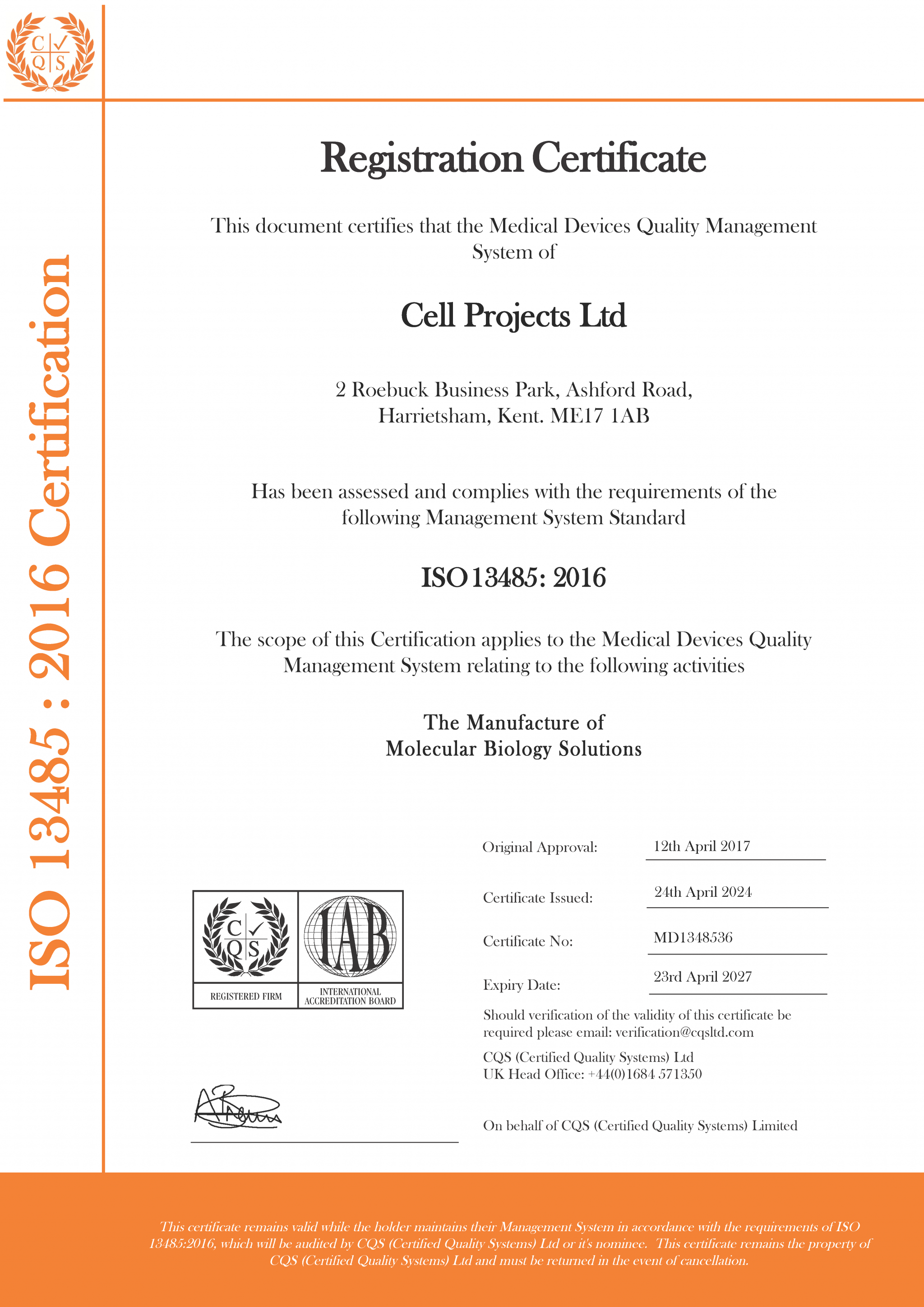 notifymailbox™ is a division of Cell Projects, the molecular biology solutions company, who were awarded the BS EN ISO 9001:2015 Quality Certification for the Supply and Manufacture of Molecular Biology Solutions in May 2017 and BS EN ISO 13485:2016 for the Supply and Manufacture of Devices used in In-Vitro Diagnostic Kits