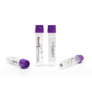 GeneFiX™ HT format with 2D barcode collects 2ml of saliva and includes Funnel, Tube Prefilled with Stabilization Buffer, Cap and Instructions. PK size 2, 12 and 50 units
