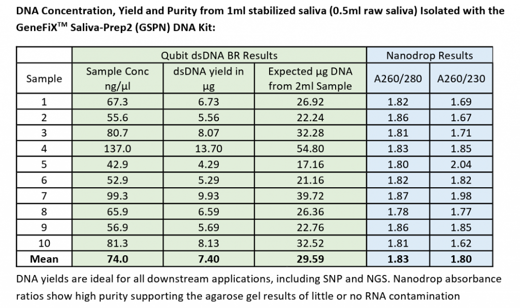 Figure 1 shows the DNA concentration, yield and purity from 0.5ml raw saliva isolated using the GeneFix Saliva-Prep2 DNA Kit [iii}